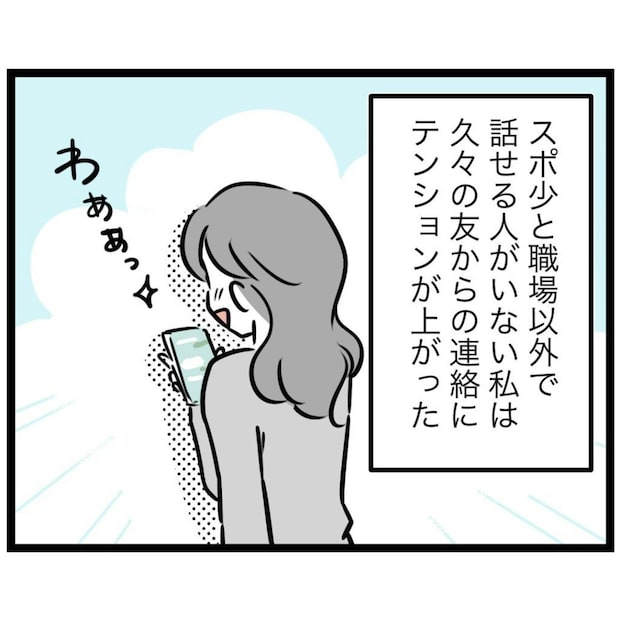 話せる人はスポ少野球か職場しかいない生活を送っていたもっつんさんのもとに、同郷の友達・トモコから連絡がありました。久々の連絡に、もっつんさんの心は踊ります。