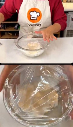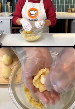 4.生地を12等分にし、中にチーズを入れて手のひらでギュッと固めるようにして丸めます。表面に軽く片栗粉をまぶすと、外側がよりカリッと香ばしく仕上がります。