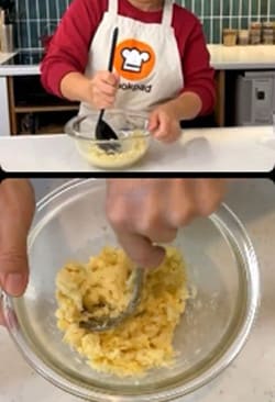 3.加熱したさつまいもが熱いうちにマッシャーやフォークで潰し、Aを加えてよく混ぜます。生地がパサついてまとまりにくい場合は、少しずつお水を足して調整するのが、きれいに丸めるコツです。