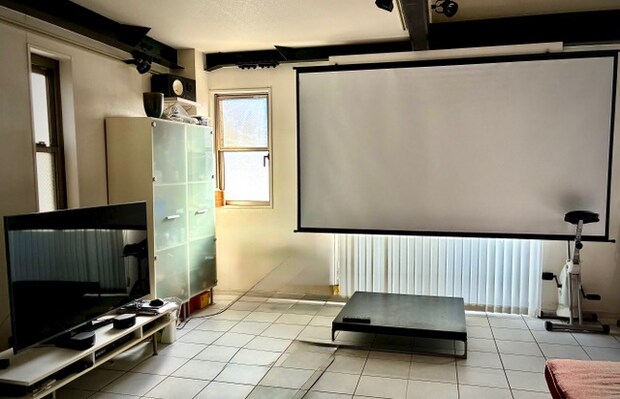拙宅のリビング。ザワザワした挙句購入した120インチのスクリーン。左隅が55インチのテレビ。もう戻れない体に(生活感アリアリの様子はご容赦)。
