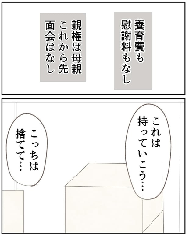 夫から離婚届を受け取り、うれしそうな顔になるゆうさん。離婚する際の取り決めもまとまり、ゆうさんは引っ越しの準備を始めました。