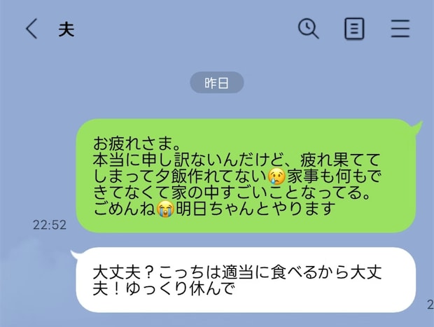 体調がすぐれなかったり疲れが限界に達したりして、どうしても家事ができない日は誰にでもあります。そんなとき「夫に申し訳ない」と罪悪感を抱いてしまう人も少なくありませんし、夫の反応によって気持ちが大きく左右されることもありますよね。今回紹介する投稿は、疲れのあまり夕飯も作れず洗濯もできなかった日のエピソードです。終電で帰ってきた夫が見せた神対応に、思わず拍手を送りたくなるような温かさが伝わってきます。