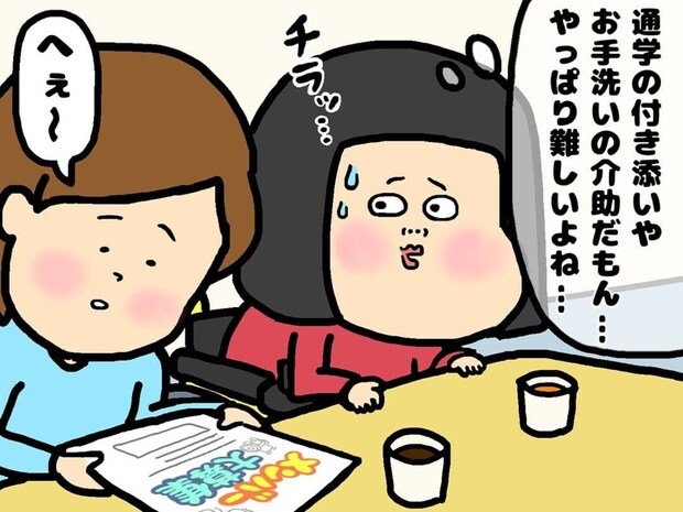 支援サークルを作ろうと、チラシを手に勧誘活動を始めた主人公。けれど心の奥では、「お手洗いの介助をお願いできる人なんて、いるのかな…」と不安がよぎっていました。