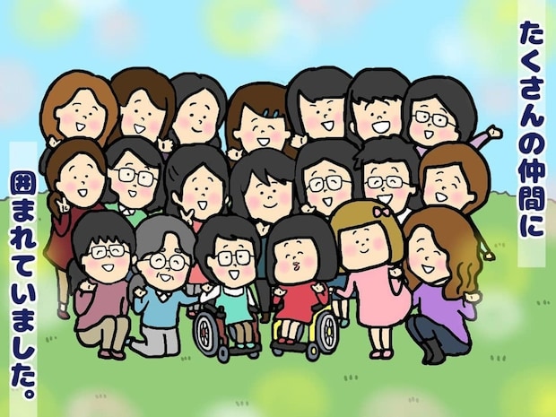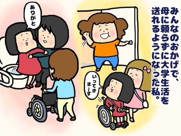 サークルの活動を通して仲間が次々と増えていった主人公。気がつけば、通学の付き添いやお手洗いの介助も母親に頼ることなく、学校生活を送れるようになっていました。