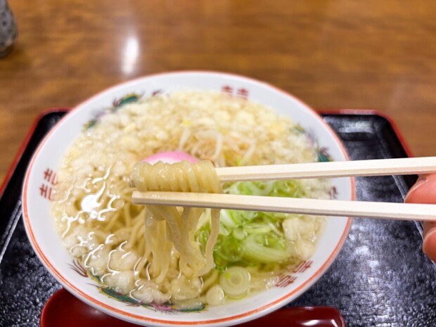 うどんのお出汁ということで透き通ったスープです。通常のラーメンと違って脂がないのでさっぱりといただけそうです。