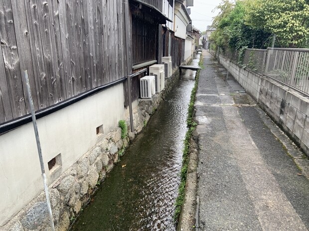 御所まちを歩いていると、民家の間に狭い水路を見かけます。こちらは、御所まちが形成された頃に造られた、環濠(かんごう)や背割り下水です。