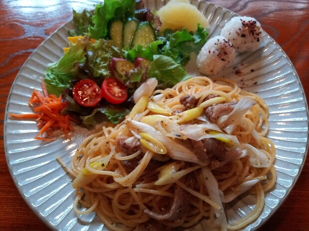 パスタメニューもおすすめです。倭鴨(やまとがも)の和風パスタ(1,500円)は、葛城山麓の養鴨場「鴨重」のブランド鴨肉を使用して作っています。出汁醤油味であっさりとしていながら、鴨肉の香ばしさも感じられる一品です。地元野菜や小さなおにぎりも添えられているので、一緒に味わってください。