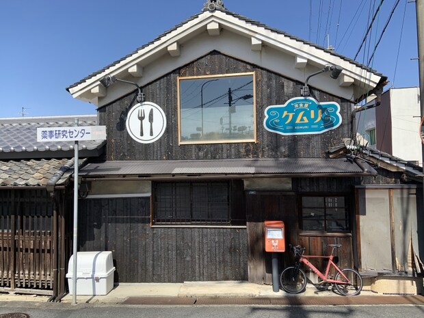 洋食屋ケムリは、地元御所の食材をランチやディナーのコース料理で提供するレストランです。建物は、たばこ屋さんとして使われていた木造の民家をリノベーションしています。柱や梁をそのまま使い、昔の雰囲気を感じながら食事が楽しめるのが魅力です。