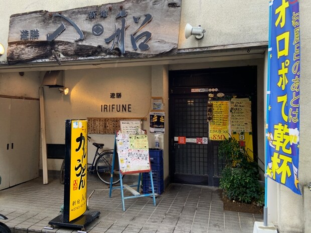 入船(いりふね)は、御所宝湯から北に歩き、新地商店街を越えたあたりにある飲食店です。定食類が色々とありますが、人気があるのが秘伝スパイスとこだわりの出汁が自慢の「カレーうどん」です。