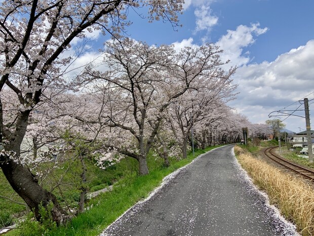 御所まちの南側を流れる柳田川(やなぎだがわ)では、春に美しい桜が観賞できます。川沿いに多数の桜が植えられており、それらがいっせいに咲く様子は見事です。