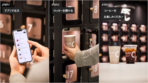 「root C」は、アプリから時間を指定して注文することで、受け取りたい時間に合わせて挽きたて、淹れたてのコーヒーを専用のロッカーから提供する、完全無人営業のコーヒースタンドだ。