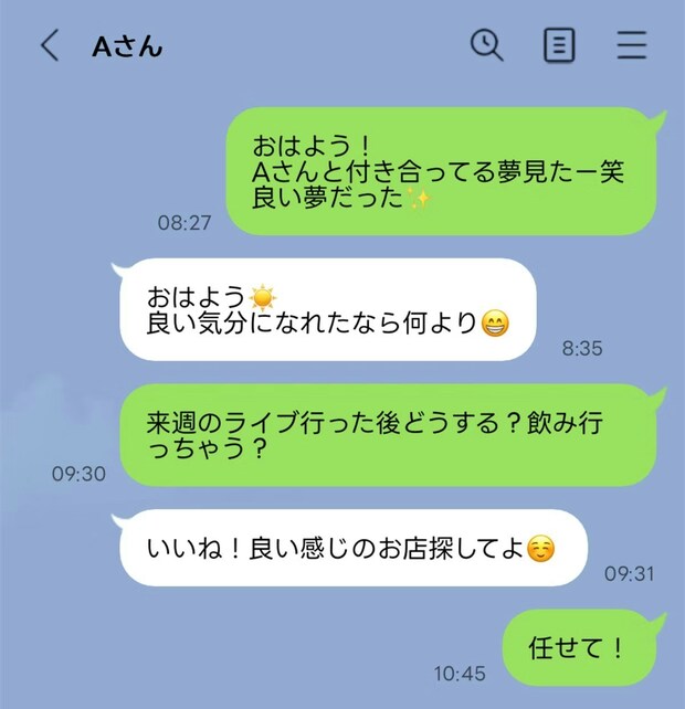 夫からおはよー!って送ってて、ほぼ毎日やりとりしてます。内容は他愛もないことですが、2人で飲みに行ったり今度ライブに行くと言ってましたがその女と一緒に行くようです。決定的な不倫の内容はないですが、「〇〇と付き合ってる夢見たー笑」「いいね教えてくれてありがとう」みたいなやりとりもあり気分悪いです