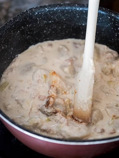 ③ ❷に牛乳を加え、ときどき混ぜながら、とろみがつくまで20~25 分煮詰める。みそを加えて混ぜ、味を見て足りなければ塩を加えて調える。