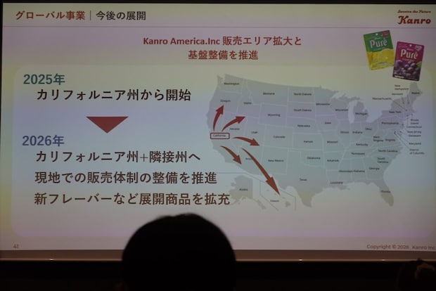 また、グローバル事業では、大きなグミ市場規模を有する米国でのピュレグミ販路拡大をさらに推進。2025年5月には「Kanro America Inc.」の現地法人を設立済みで、展示会への出展やサンプリングではピュレグミならではのフルーティな味わいやパッケージデザインについて高評価を獲得しているとのこと。9月にはすでに米国カリフォルニア州での販売を開始しており、2026年1月11日(日)~13日(火)にはカリフォルニア州サンディエゴで開催された「Winter Fancy Faire 2026」に、2月には大学生協の展示会「CAMEX Campus Market Expo」に出展することで認知度を広め、今後はカリフォルニア州から隣接州への販路拡大も視野に入れています。