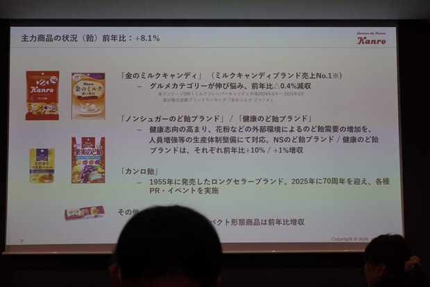 この結果を受け同社は、「2025年度の市場規模は、のど飴の伸張、グミ市場の拡大等によりプラス9.1%の成長、3818億円に拡大をいたしました。初めて年間のグミ販売金額が、アメの販売金額を超える年となっております。弊社はハードキャンディとグミの2つのカテゴリーを主戦場としておりますが、ハードキャンディーはのど飴需要の増加を背景に前年比プラス 3.9%の拡大となりました。市場拡大を牽引するグミはハード食感のグミを中心に引続き高い成長を維持しており、前年比プラス14%の身長となっております」と報告。激しい市場変化の中での業績を発表しました。