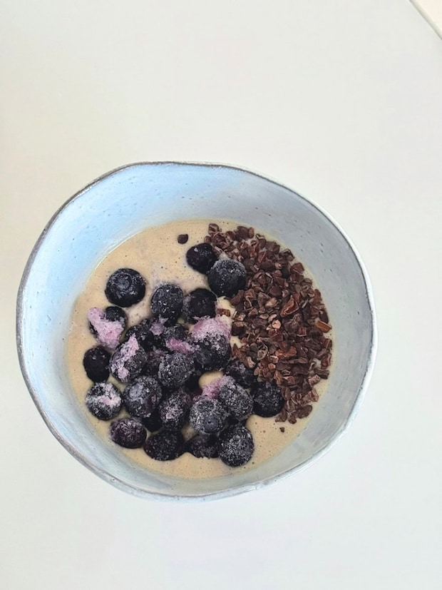 B 前日の夜にローストしたオーツ麦(10)とオーツミルクを混ぜておいて、人工甘味料不使用のホエイプロテイン(11)、ブルーベリー、カカオニブ、アガベシロップを少し。タンパク質と食物繊維が効率よく摂れて、低GI。これにゆで卵を追加すれば完璧!