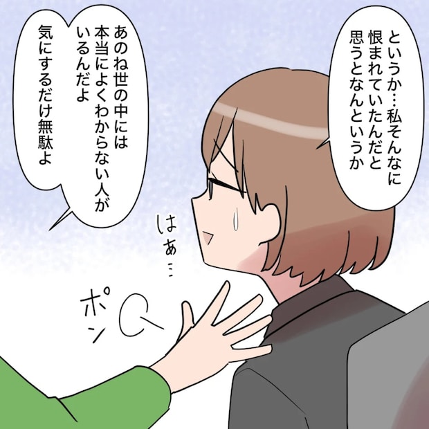 「というか・・・私そんなに恨まれていたんだと思うとなんというか」そう言ってため息をつくと、藤澤さんは私の肩をポンと叩き、「あのね、世の中には本当によくわからない人がいるんだよ、気にするだけ無駄よ」と、やさしくフォローしてくれました。