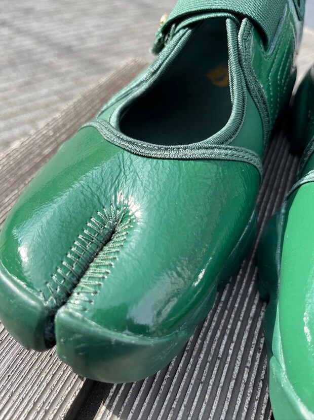 アッパーとかかとのストラップにメタルチャームが施されています。グリーンとのマッチングも◎