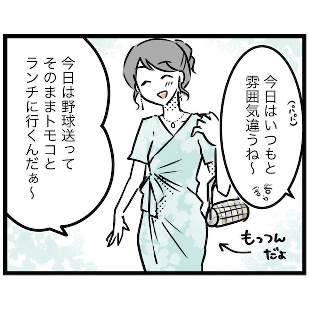 野球の練習に息子を送った後、友達とランチに行くもっつんさん。オシャレをして、ウキウキで出かけていきます。