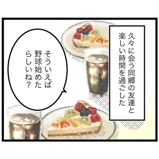 スポ少野球チームの居心地の悪さに疲れていたもっつんさんに、同郷の友達から連絡がありました。久々に会うことになり、もっつんさんの気持ちは弾みます。