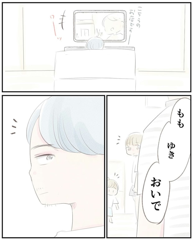 ゆうさんの荷物が運ばれていく中、夫はテレビを見ていたようです。ゆうさんは、娘たちと一緒に夫にお別れのあいさつをしました。