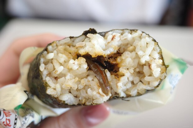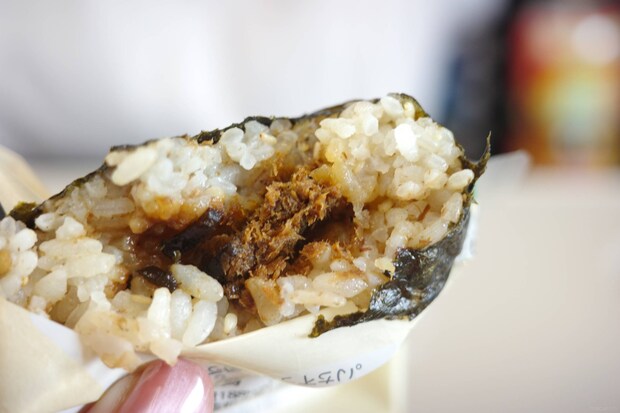 まず感じるのは、海苔の香り。次に、おかかごはんのやさしい旨みが広がり、少し遅れて昆布の佃煮のコクが追いかけてきます。