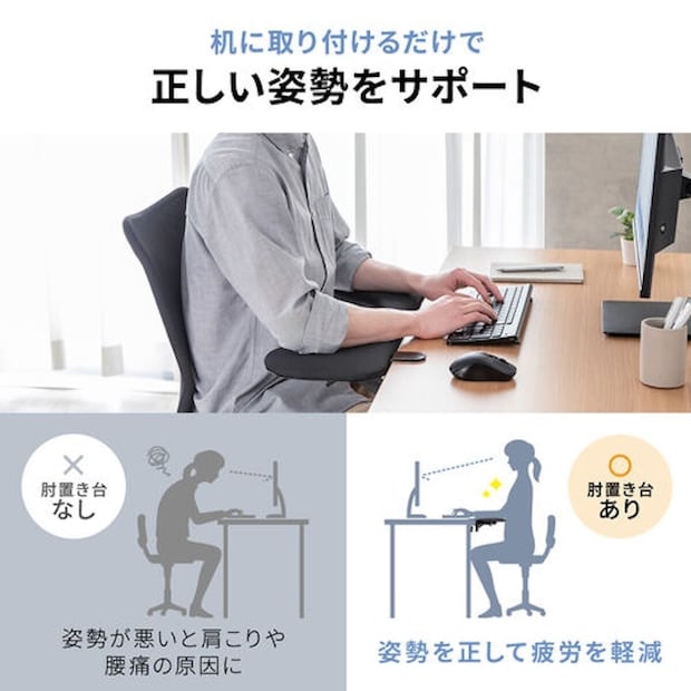 肘を自然に置ける位置に支えを設けることで、肩や肘が上がりすぎるのを防ぎます。さらに、キーボード操作時に前のめりになりがちな姿勢を抑え、無理のないポジションを保てます。