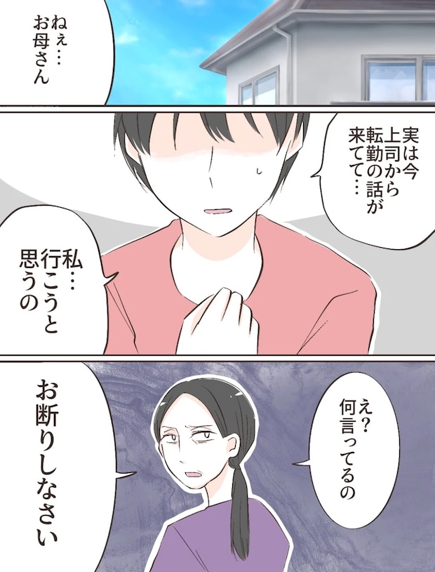 翌日、私は意を決して「ねぇお母さん、実は今上司から転勤の話が来てて、私・・・行こうと思うの」転勤の打診があったこと、そしてその話を前向きに考えていることを伝えます。しかし、母はバッサリと却下。「え?何言ってるの、お断りしなさい」その一言で、私の転勤は容赦なく撃ち落とされてしまいました。
