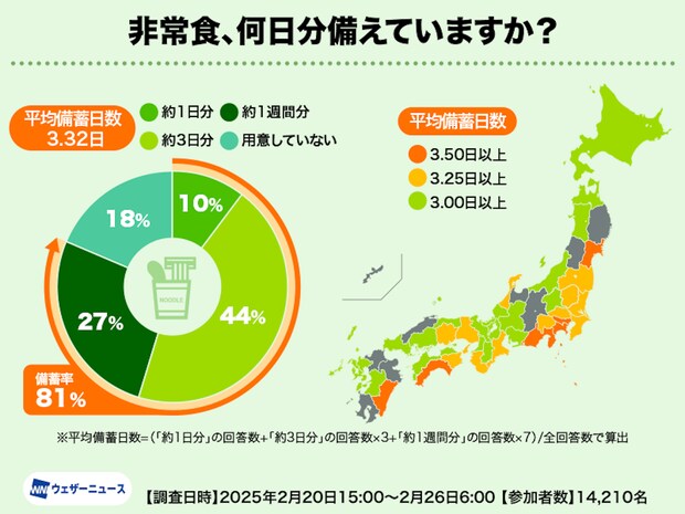 ウェザーニュースの調査によると、非常食の備蓄率は81.6%と高い割合に。