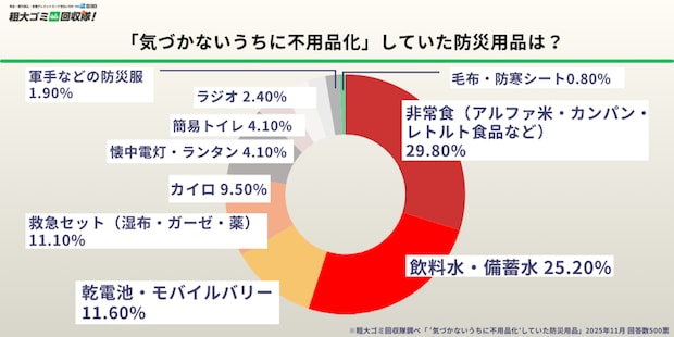 一方、粗大ゴミ回収隊の調査では、気づかないうちに不要品化していた防災用品1位は「非常食(29.8%)」という結果に。