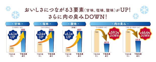 同商品は、専用パウチに下味用のソースが入っており、お肉を直接入れてそのまま冷凍保存ができます。下味冷凍することで甘味や塩味などの旨みが引き立ち、お肉の臭みを抑える独自の設計を追求しました。実際に同商品を使い、下味冷凍した場合と、下味をつけず冷凍し調理した場合を比較すると、下味をつけてから冷凍したほうがおいしさにつながる3要素(甘味・塩味・酸味)がアップし、肉の臭みがダウンすることがわかりました。