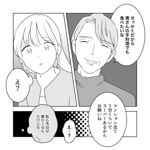 和男さんは「せっかくだから奥さんの手料理でも食べたいな」とにっこり。予想外の言葉に驚いてすぐに返事ができないでいると、「マンション出て5分くらいでスーパーあるからお願いね」と私の返事を待たずに和男さんが言いました。あれ?私の意見は聞いてくれないの・・?今までなら「何が食べたい?」とか聞いてくれていたのに・・。それに、私も今日は荷物を運んだり片付けたりして疲れてるんだけどな・・。