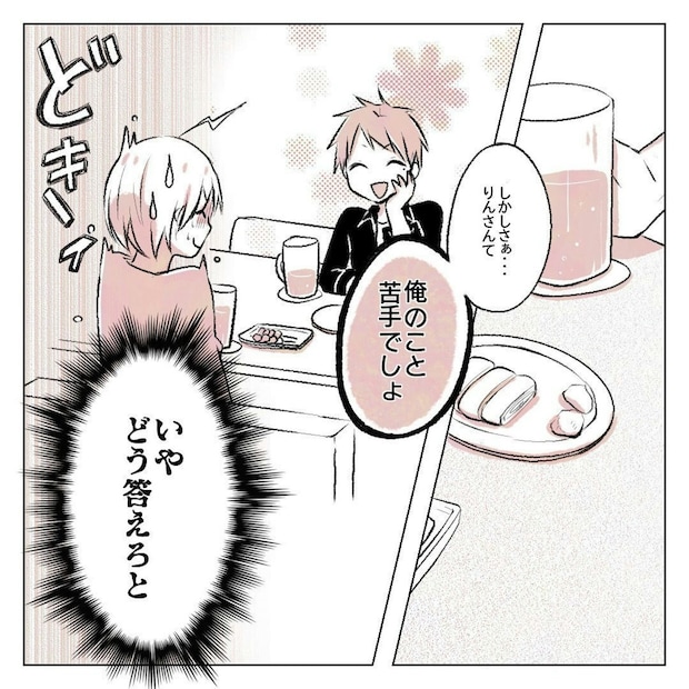 先輩・ゆーさんとの飲み会当日、りんさんの疲れた様子が気になったゆーさん。りんさんが彼氏と別れたというと、ゆーさんにそれを茶化されてしまいました。そんなゆーさんが「俺のこと苦手でしょ?」と言うので、りんさんは図星をさされて焦ってしまいます。