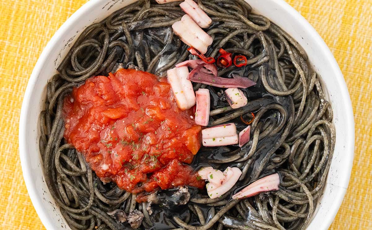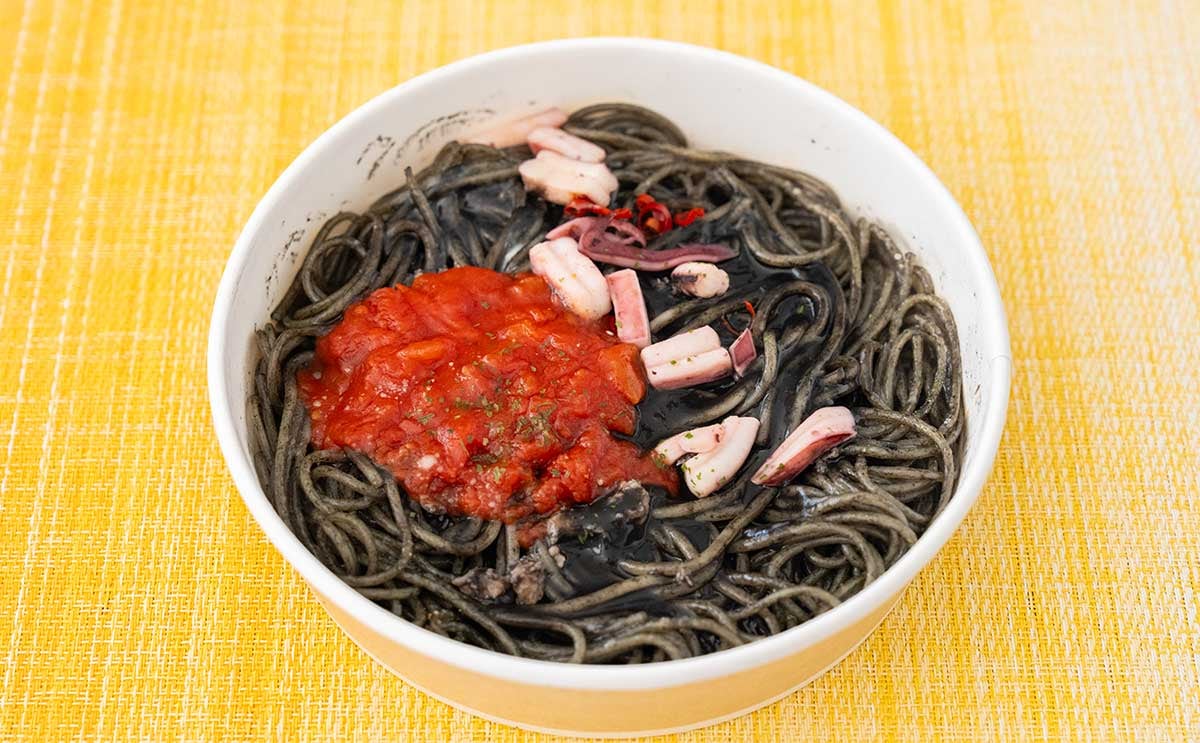 イカスミを使用した真っ黒なソースがからんだパスタの上に、真っ赤なトマトソースがトッピングされています。なかなかインパクトのある見た目ですよね。