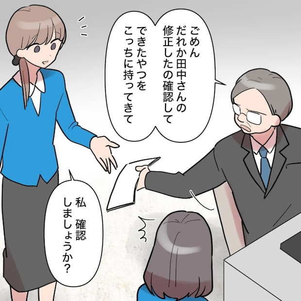 上司は埒が明かないと思ったのか「ごめん、だれか田中さんの修正したの確認して、できたやつをこっちに持ってきて」と修正資料を他の社員に渡そうとしました。「私、確認しましょうか?」そう言って、ひとりの社員が資料に手を伸ばした瞬間ー・・・