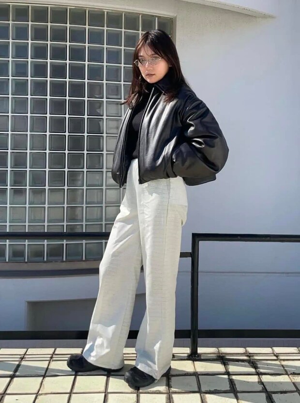 白いパンツとレザーブルゾンの質感がシンプルコーデを華やかに