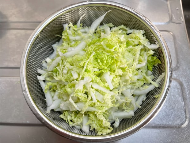 ・白菜は細切りにし、塩をふって軽くもむ。15分ほど置いたら、水でサッと洗い、水気をしっかり絞る。
