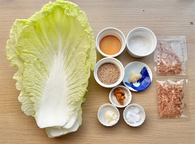 1. ボウルに白菜、白いりゴマ、かつお節を入れ、[A]を加えて全体をよく和える。