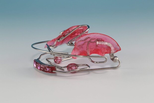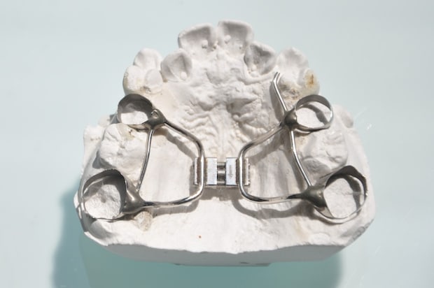 お子さんの歯並びの状態に応じて、いくつかの方法を組み合わせます。例えば、顎を広げてスペースを作る場合は、「拡大床」(写真[下])という取り外し式の装置を使うのが一般的です。
