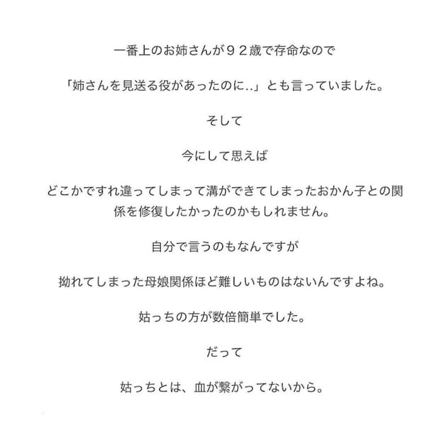 おかんさんのお母さんは、親子関係を少しでも良くしたいという思いから、最終的におかんさんに介護を頼ったようです。しかし、そのことはおかんさんにとって、精神的にとてもつらいことでした。