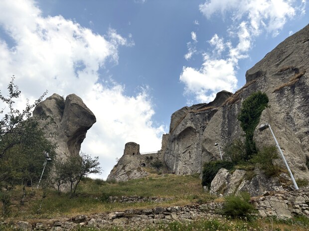 息を切らしながら山頂まで登っていくと墓石状の要塞が現れ、展望台からは渓谷や山々の絶景を見渡すことができます。