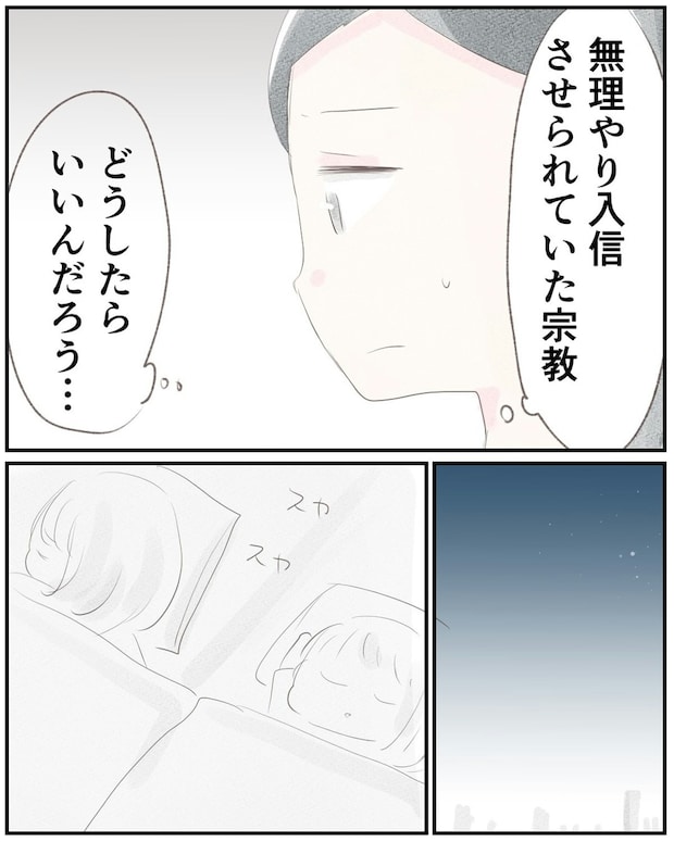 離婚が決まり、しばらくは母親のところにお世話になることになったゆうさん。荷物の整理などを終えて、次は「宗教」をやめる方法を考えます。ネットで調べてみると、仲介をしてくれる業者があるようで問い合わせてみることに。