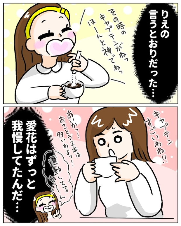 「りえの言う通りだった・・愛花はずっと我慢してたんだ・・」と心の中で呟きながら、「その時のキャプテンがねっ、ほーんと神でねっ!」と嬉しそうに話す愛花に、「キャプテンすごいわね!!」と相づちをしたのでした。