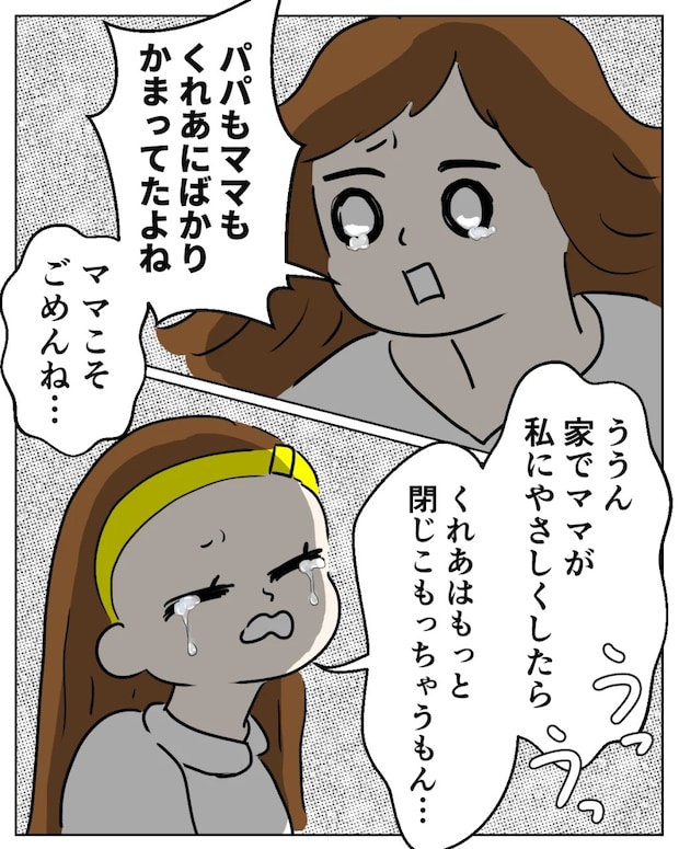 その後、「パパもママもくれあにばかりかまってたよね。ママこそごめんね」と泣きながら謝ると、「ううん。家でママが私にやさしくしたら、くれあはもっと閉じこもっちゃうもん・・うっ・・うっ・・」と泣きながら愛花がそう言いました。