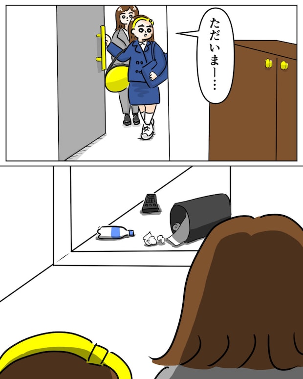 そして「ただいまー・・」家に帰ってドアを開けると部屋の中は静まり帰っていて、廊下にはゴミ箱が倒れ、中に入っていたゴミやペットボトルが散乱していました。その様子を見て嫌な予感がする私。