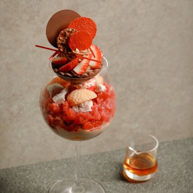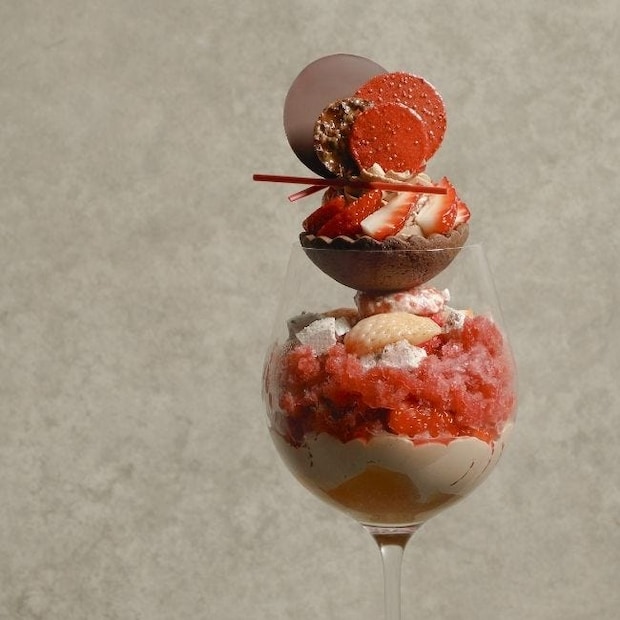 グラスの中には、フレッシュないちごをふんだんにあしらい、なめらかなディプロマットクリームが果実の甘みと酸味を優しく引き立てくれる。ザクザクとした軽快な食感と香ばしさをもたらす苺のチュイルとアーモンドクッキーや、さっぱりとした苺とサングリアのグラニテなどが層となり、一口ごとに広がるハーモニーを感じられる。
