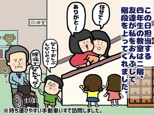 小学校に到着した主人公は、友人に背負われて授業をする教室に向かいます。