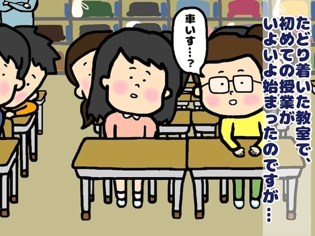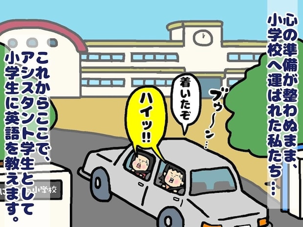 小学校で英語を教えることになった主人公。心の準備もないまま、先生に連れられて小学校へ向かいます。