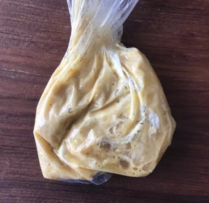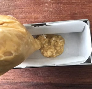 2.ポリ袋のはしをカットして、型に流し込みましょう。