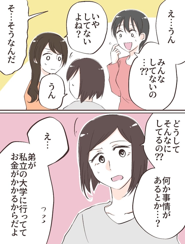 同僚たちの反応に、私はきょとんとして、「え・・・うん、みんなしてないの?」と聞き返しました。すると2人は顔を見合わせて、「いや、してないよね?」「うん」と、どこか戸惑った様子。「どうしてそんなにしてるの?何か事情があるとか?」そう聞かれた私は当たり前のように「え、弟が私立の大学に行っててお金がかかるからだよ」と答えました。